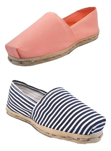 Pack de alpargatas iberia con modelos rayado azul/blanco y otro coral con un rango de talla 34 a 39.
