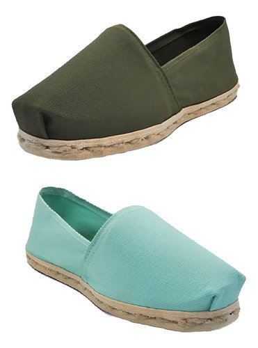 Pack de alpargatas iberia con modelos verde militar y otro turquesa con un rango de talla 34 a 39.