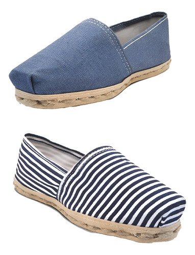 Pack de alpargatas iberia con modelos de mezclilla y otro de color rayado azul/blanco con un rango de talla 34 a 49.