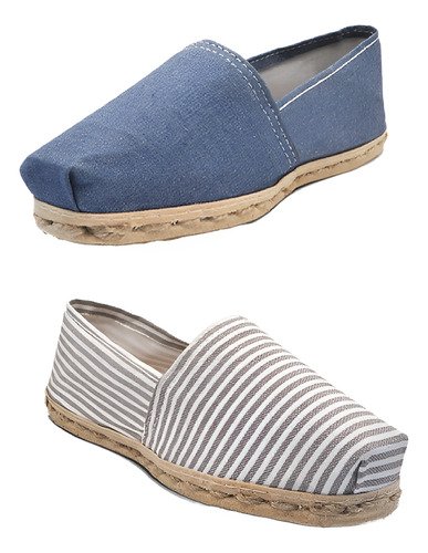 Pack de alpargatas iberia con modelos de mezclilla y otro de color rayado gris/blanco con un rango de talla 34 a 39.