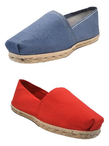 Pack de alpargatas iberia con modelos de mezclilla y otro de color rojo con un rango de talla 34 a 49.