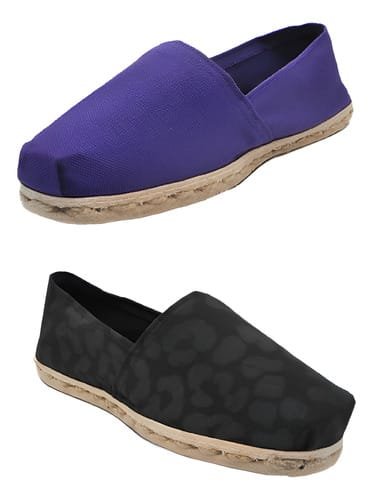 Pack de alpargatas iberia con modelos morados y otro animal print negro con un rango de talla 34 a 39.