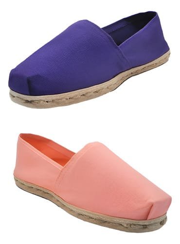 Pack de alpargatas iberia con modelos morados y otro coral con un rango de talla 34 a 39.