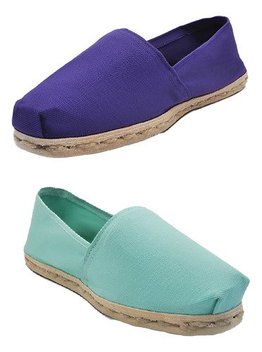 Pack de alpargatas iberia con modelos morados y otro turquesa con un rango de talla 34 a 39.