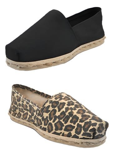 Pack de alpargatas iberia con modelos de color negro y otro de color animal print con un rango de talla 34 a 39.
