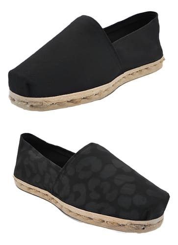 Pack de alpargatas iberia con modelos de color negro y otro de color animal print negro con un rango de talla 34 a 39.