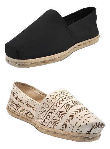 Pack de alpargatas iberia con modelos de color negro y otro de crudo etnico con un rango de talla 34 a 39.