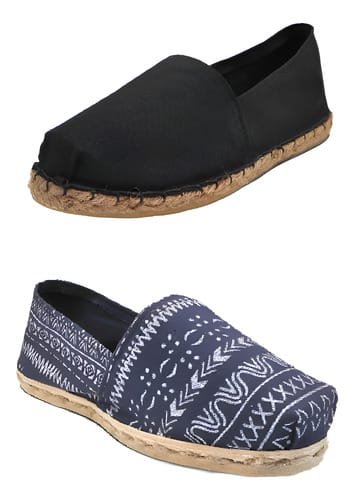 Pack de alpargatas iberia con modelos de negro con refuerzo de goma y otro azul etnico con un rango de talla 34 a 39.