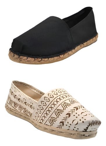 Pack de alpargatas iberia con modelos de negro con refuerzo de goma y otro crudo etnico con un rango de talla 34 a 39.