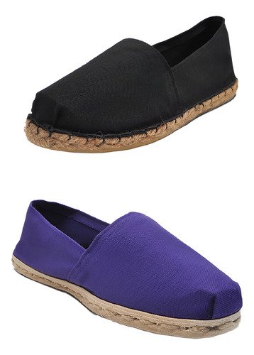 Pack de alpargatas iberia con modelos de negro con refuerzo de goma y otro morado con un rango de talla 34 a 39.