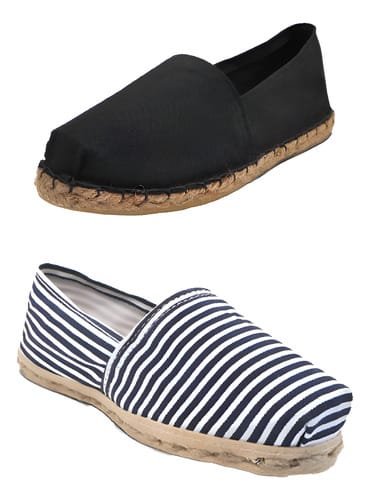 Pack de alpargatas iberia con modelos de negro con refuerzo de goma y otro rayado azul/blanco con un rango de talla 34 a 39.