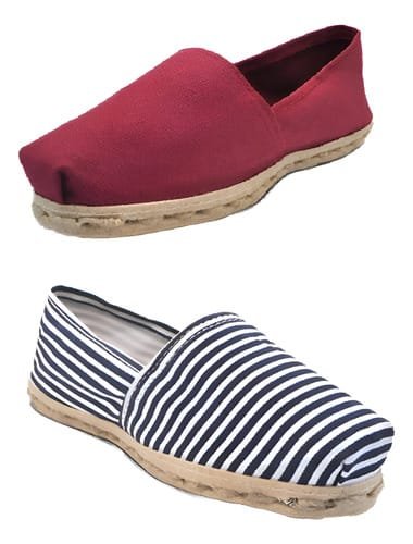 Pack de alpargatas iberia con modelos rayados azul/blanco y otro burdeo con un rango de talla 34 a 39.