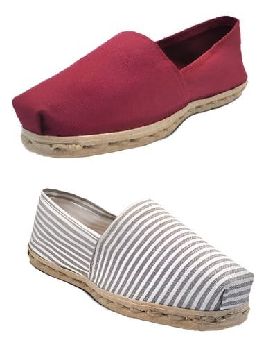 Pack de alpargatas iberia con modelos rayados gris/blanco y otro burdeo con un rango de talla 34 a 39.
