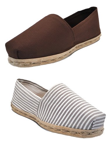 Pack de alpargatas iberia con modelos rayados gris/blanco y otro cafe con un rango de talla 34 a 39.
