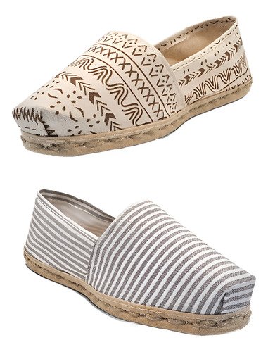 Pack de alpargatas iberia con modelos rayado gris/blanco y otro crudo etnico con un rango de talla 34 a 39.