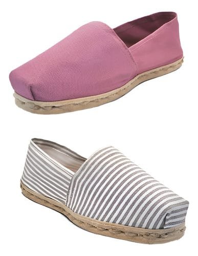 Pack de alpargatas iberia con modelos rayado gris/blanco y otro Jacaranda con un rango de talla 34 a 39.