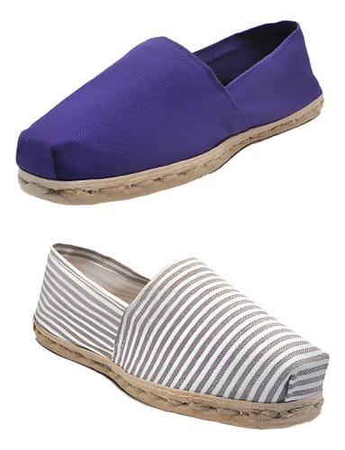 Pack de alpargatas iberia con modelos rayado gris/blanco y otro morado con un rango de talla 34 a 39.