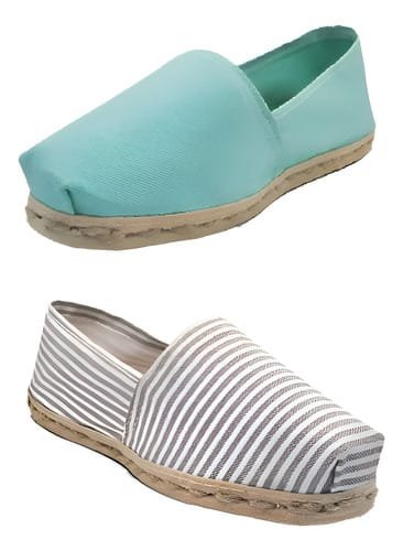 Pack de alpargatas iberia con modelos rayado gris/blanco y otro turquesa con un rango de talla 34 a 39.
