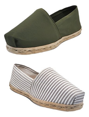 Pack de alpargatas iberia con modelos rayados gris/blanco y otro verde militar con un rango de talla 34 a 39.
