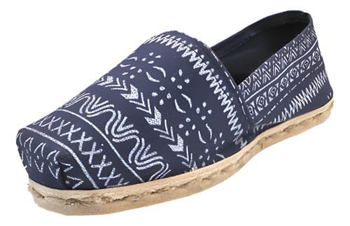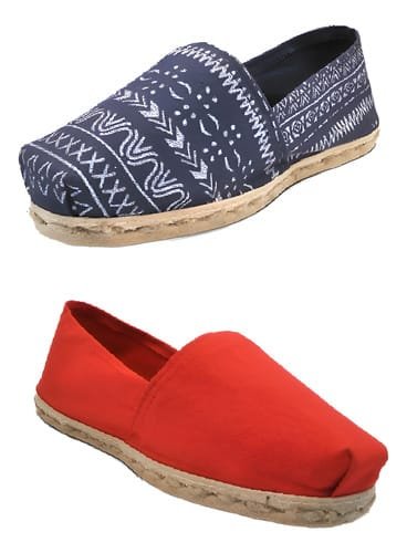 Pack de alpargatas iberia con modelos de color rojo y otro azul etnico con un rango de talla 34 a 39.