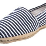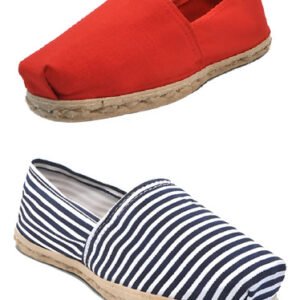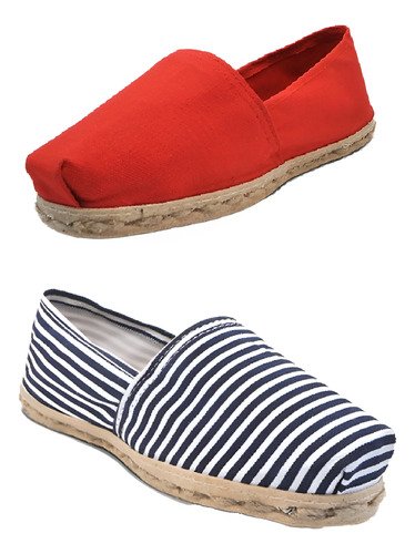 Pack de alpargatas iberia con modelos de color rojo y otro de rayado azul/blanco con un rango de talla 34 a 39.