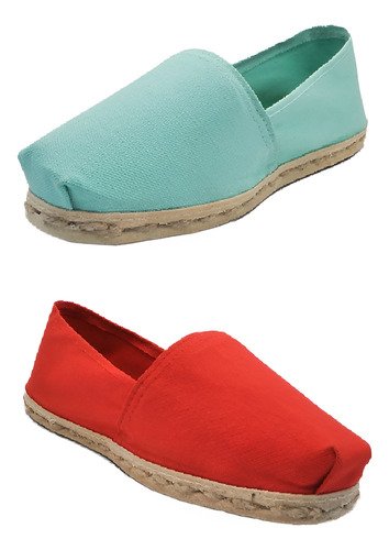 Pack de alpargatas iberia con modelos de color rojo y otro turquesa con un rango de talla 34 a 39.