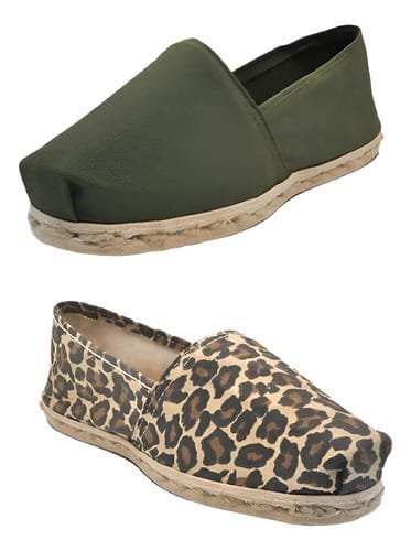 Pack de alpargatas iberia con modelos verde militar y otro animal print con un rango de talla 34 a 39.