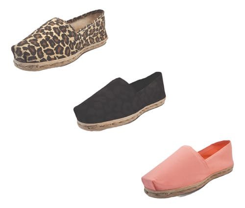 TriPack de alpargata iberia con modelos animal print, animal print negro y coral con un rango de talla de 34 a 39.