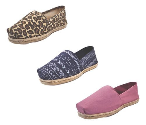 TriPack de alpargata iberia con modelos animal print, azul étnico y jacarandá con un rango de talla de 34 a 39.