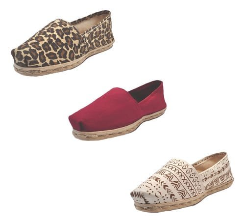 TriPack de alpargata iberia con modelos animal print, burdeo y crudo étnico con un rango de talla de 34 a 39.
