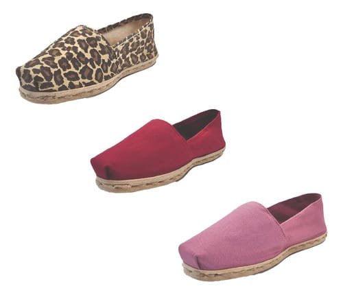 TriPack de alpargata iberia con modelos animal print, burdeo y jacarandá con un rango de talla de 34 a 39.