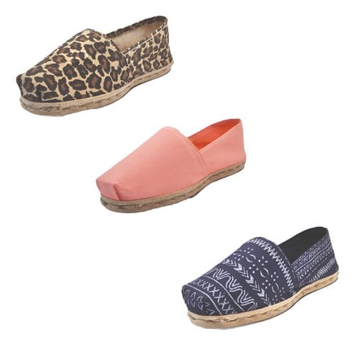 TriPack de alpargata iberia con modelos animal print, coral y azul étnico con un rango de talla de 34 a 39.