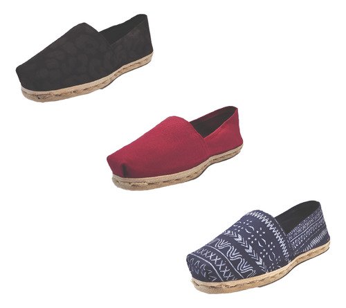 TriPack de alpargata iberia con modelos animal print negro, burdeo y azul étnico con un rango de talla de 34 a 39.