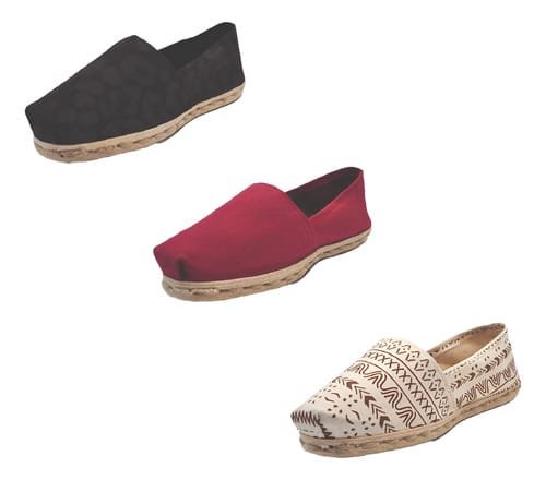 TriPack de alpargata iberia con modelos animal print negro, burdeo y crudo étnico con un rango de talla de 34 a 39.