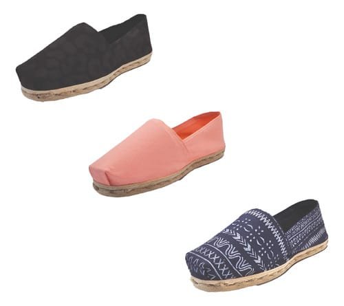 TriPack de alpargata iberia con modelos animal print negro, coral y azul étnico con un rango de talla de 34 a 39.