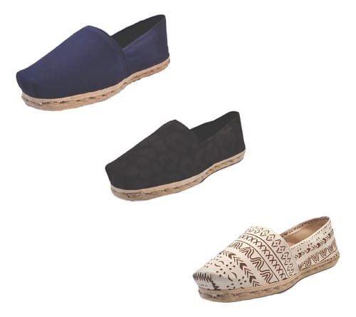TriPack de alpargata iberia con modelos azul marino, anim print neg y crudo étnico con un rango de talla de 34 a 39.