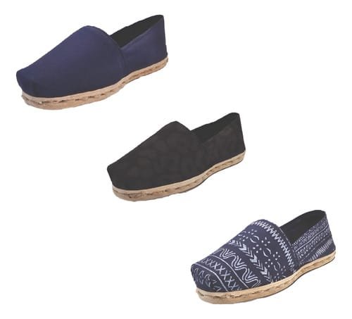TriPack de alpargata iberia con modelos azul marino, anima print neg y azul étnico con un rango de talla de 34 a 39.