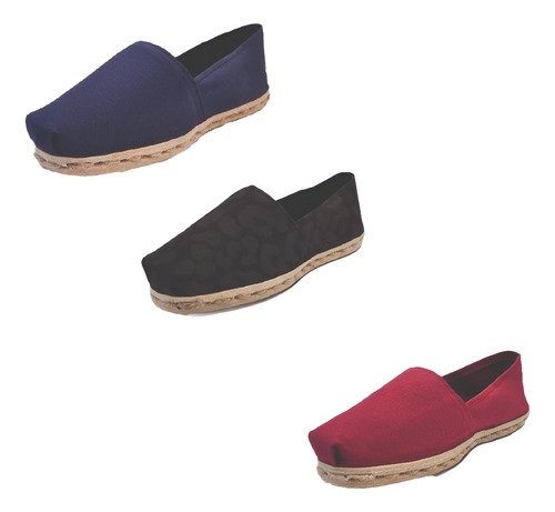 TriPack de alpargata iberia con modelos azul marino, animal print negro y burdeo con un rango de talla de 34 a 39.