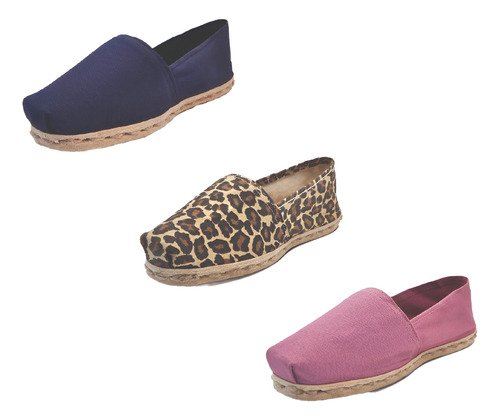 TriPack de alpargata iberia con modelos azul marino, animal print y jacarandá con un rango de talla de 34 a 39.