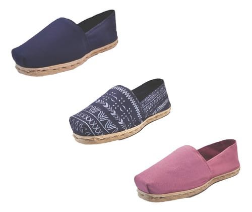 TriPack de alpargata iberia con modelos azul marino, azul étnico y jacarandá con un rango de talla de 34 a 39.