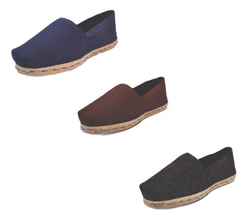 TriPack de alpargata iberia con modelos azul marino, café y animal print negro con un rango de talla de 34 a 39.