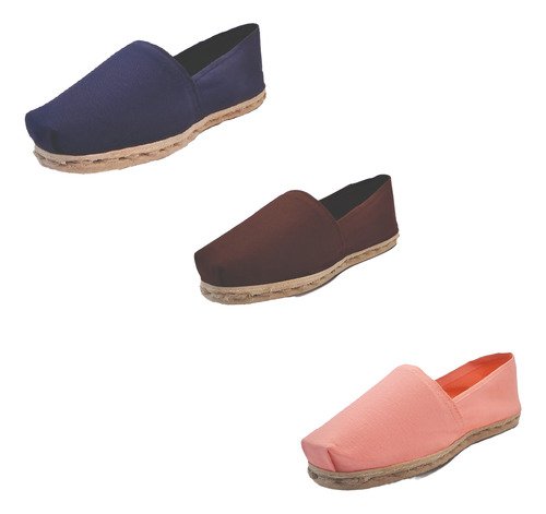 TriPack de alpargata iberia con modelos azul marino, café y coral con un rango de talla de 34 a 39.