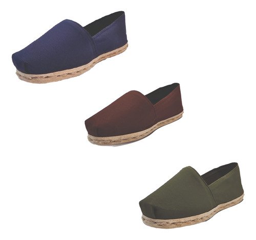 TriPack de alpargata iberia con modelos azul marino, café y verde militar con un rango de talla de 34 a 42.