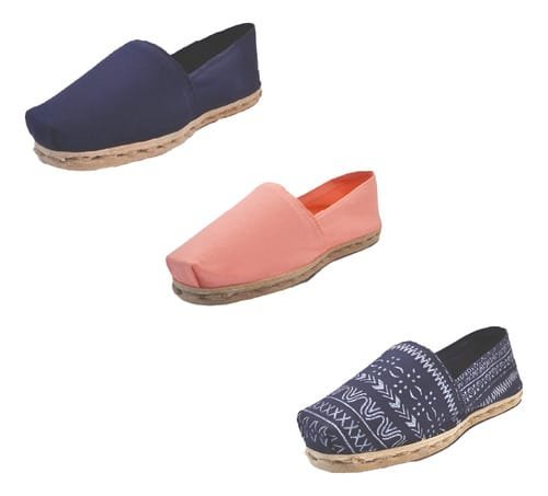 TriPack de alpargata iberia con modelos azul marino, coral y azul étnico con un rango de talla de 34 a 39.