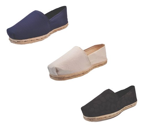 TriPack de alpargata iberia con modelos azul marino, crudo y animal print negro con un rango de talla de 34 a 39.