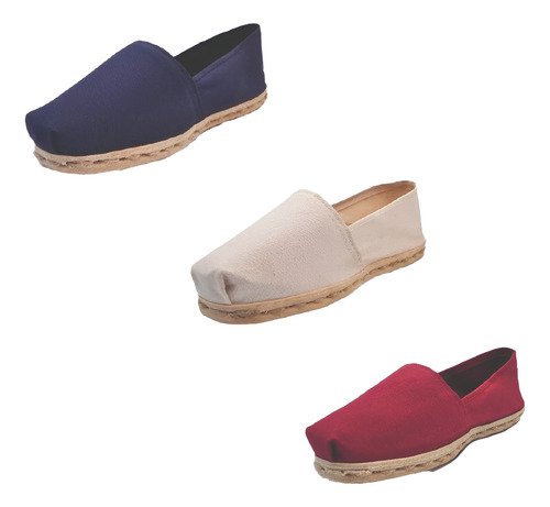 TriPack de alpargata iberia con modelos azul marino, crudo y burdeo con un rango de talla de 34 a 42.