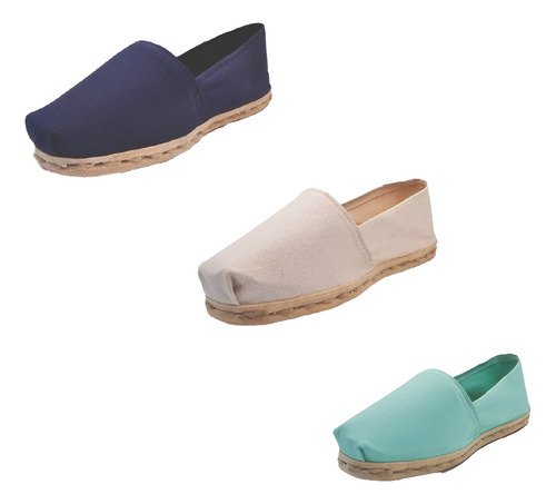 TriPack de alpargata iberia con modelos azul marino, crudo y turquesa con un rango de talla de 34 a 39.