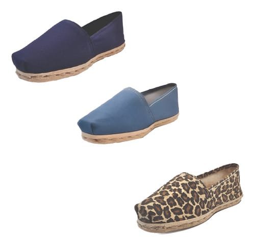 TriPack de alpargata iberia con modelos azul marino, mezclilla y animal print con un rango de talla de 34 a 39.