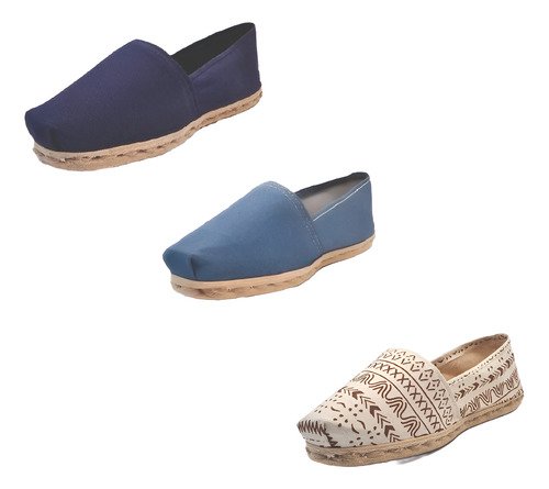 TriPack de alpargata iberia con modelos azul marino, mezclilla y crudo étnico con un rango de talla de 34 a 39.