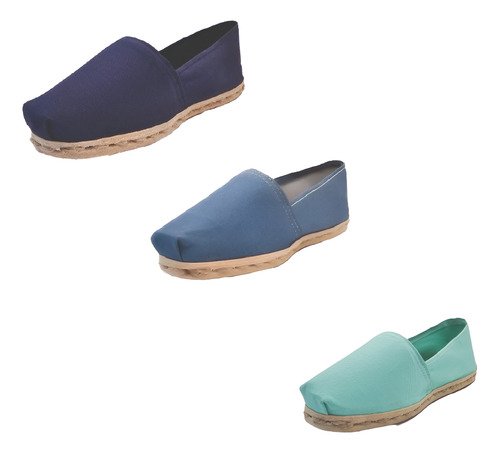 TriPack de alpargata iberia con modelos azul marino, mezclilla y turquesa con un rango de talla de 34 a 39.